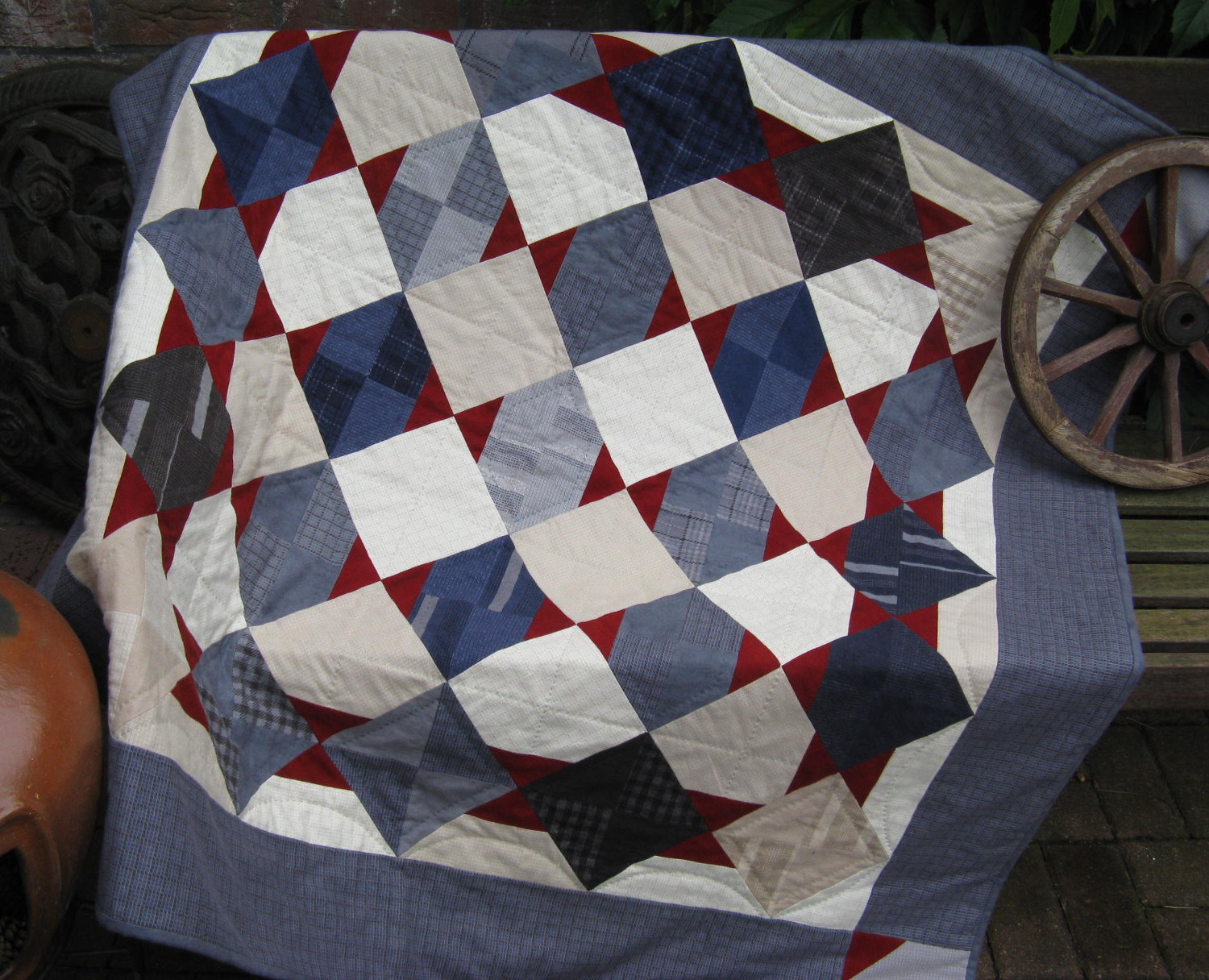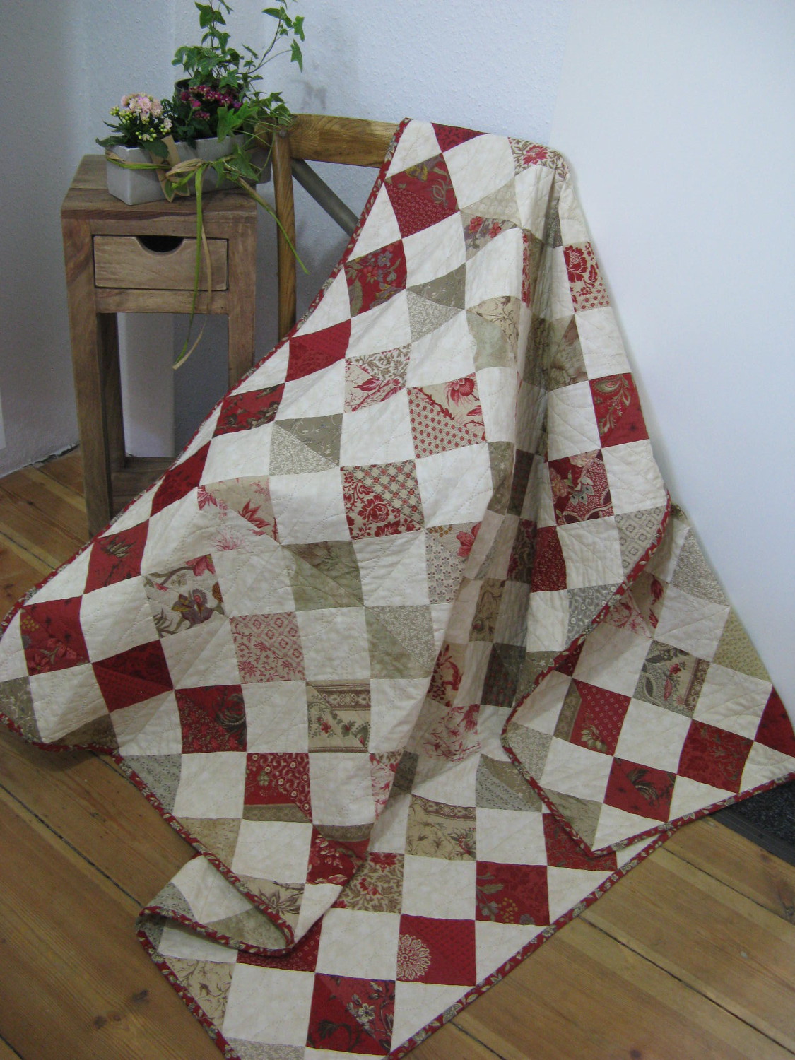 Stoffe aus Flanell - wunderbar weich und leicht nähbar - erfreuen sich immer größerer Beliebtheit, nicht nur für die Rückseite von Kuschelquilts. Hier stehen die rauchigen Blau- und Grautöne in gelungenem Kontrast zu den roten und cremefarbenen Flanellstoffen.