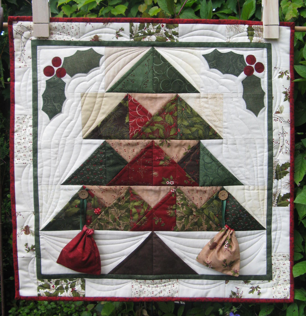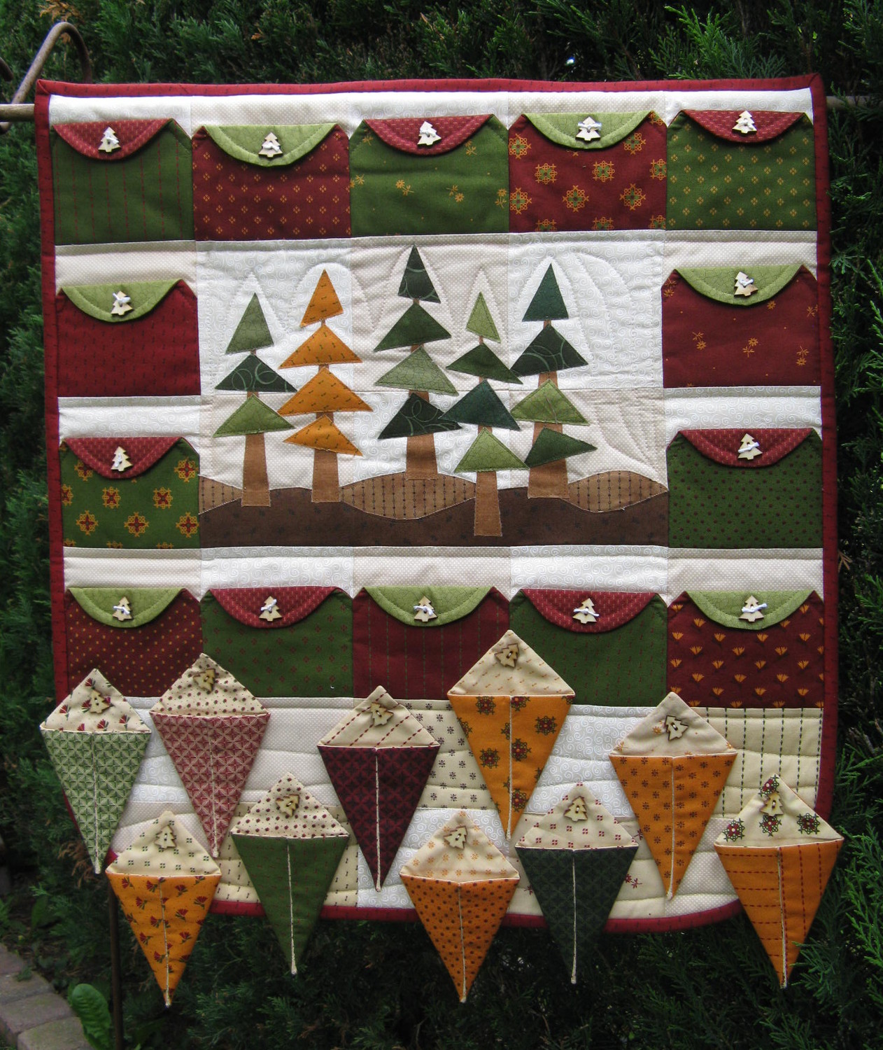 Rund um die kleine Lichtung im Tannenwäldchen und in den angehängten Tütchen sind die beliebten vorweihnachtlichen Überraschungen versteckt. Vorgeschnittene Quadrate aus Charmpäckchen, wenige Beistoffe und die einfache Art der Applikation lassen dieses Projekt noch rechtzeitig fertig werden.