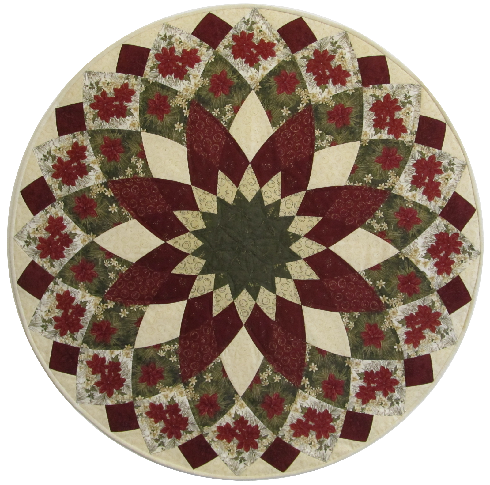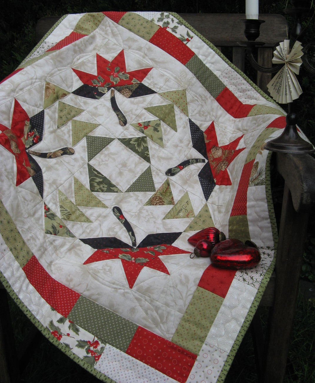 Der Lone Star in allen erdenklichen Größen und Gestaltungsvarianten war, ist und bleibt ein absoluter Klassiker für jeden Patchworker. Wenigstens einmal möchte man ihn genäht haben. Hier erscheint er durch die festliche Borte im weihnachtlichen Kleid und erhält durch den Wirbel einen modernen, pfiffigen Anstrich.